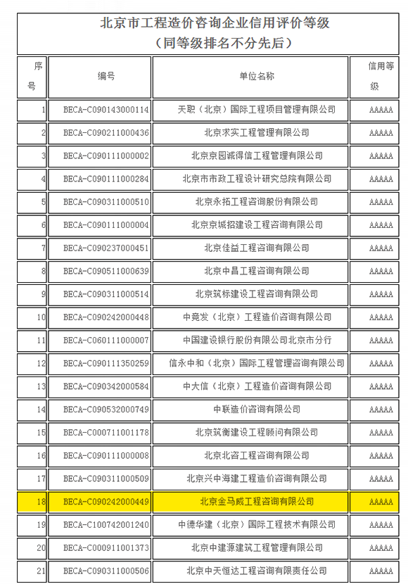 本次評選活動專家組按照中價協《工程造價咨詢企業信用評價標準》規定,分別到咨詢企業現場核查了造價咨詢成果文件,企業檔案管理和職工的社會保障,以及黨建、工會的建立等資料。最后集中所有專家對咨詢企業申報的資料并結合現場核查情況,依據信用評價標準評審出了177家工程造價咨詢企業信用等級的結果,我公司榮獲北京市工程造價咨詢企業信用評價5A級企業。
