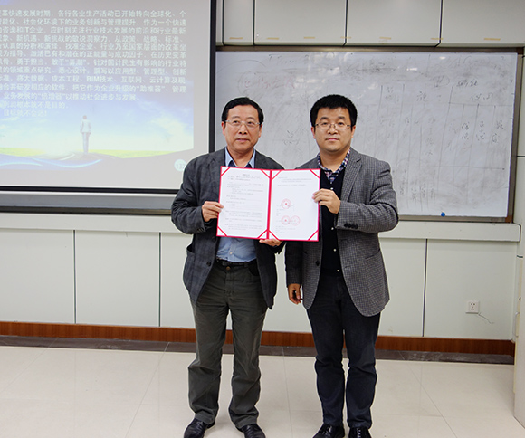 2014年11月14日下午,公司董事長(zhǎng)周和生應(yīng)重慶大學(xué)邀請(qǐng),為重慶大學(xué)建設(shè)管理與房地產(chǎn)學(xué)院學(xué)生及相關(guān)部門工作人員作了題為“建設(shè)項(xiàng)目全過(guò)程投資管理及審計(jì)系統(tǒng)介紹”的學(xué)術(shù)報(bào)告。并向?qū)W院捐贈(zèng)“建設(shè)項(xiàng)目全過(guò)程投資管理與審計(jì)系統(tǒng)”軟件,大力支持學(xué)校教學(xué)工作。竹隰生院長(zhǎng)代表學(xué)院出席此次捐贈(zèng)儀式。
