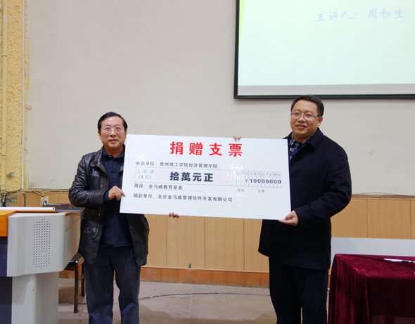 2014年12月5日下午,公司董事長周和生向貴州理工學(xué)院經(jīng)濟管理學(xué)院捐贈“建設(shè)項目全過程投資管理與審計系統(tǒng)”軟件,并向?qū)W院捐贈十萬元教學(xué)基金,大力支持學(xué)校教學(xué)和科研工作。